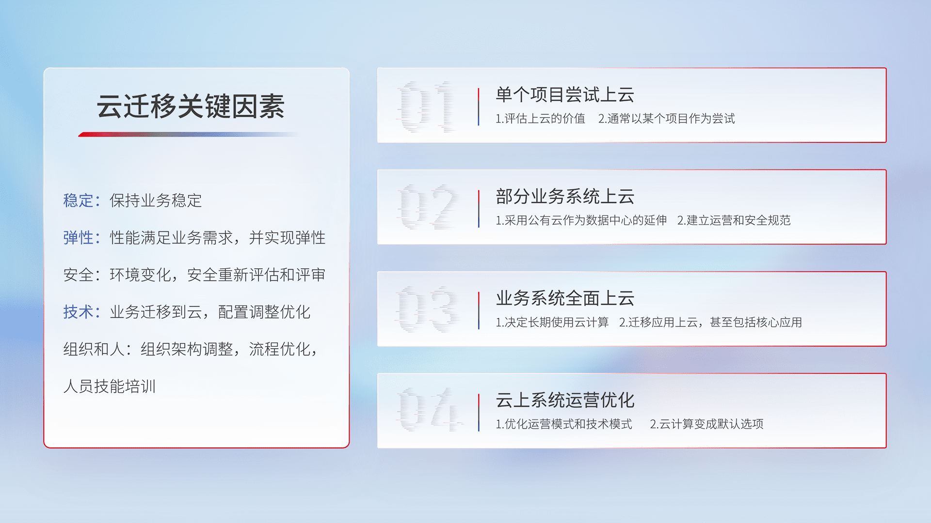 结合实际业务,,,,从规划设计、、云平台选型、、、、云原生改造、、、数据迁移、、集成交付,,迁移全过程为客户识别最佳上云路径,,做好风险识别管理,,,,设计网络架构、、身份权限、、、、安全审计合规、、、操作审计、、、、日志审计、、、、监控告警策略、、、、多站点容灾设计等,,,对云上基础设施进行整体规划,,提升IT治理水平,,,以满足弹性、、、高可用、、、、高性能的需求。。。。